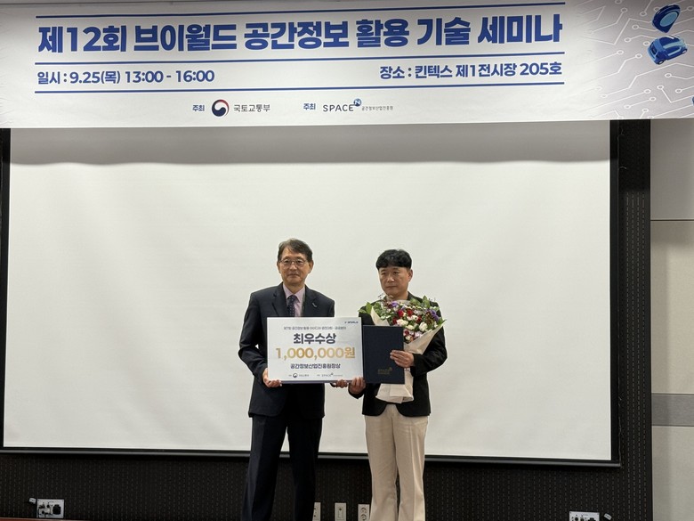 대회 시상식은 25일 일산 킨텍스에 열린 ‘2025 공간정보기술박람회(K-Geo Festa)’에서 진행됐으며, 심사는 공간정보를 활용한 기관 업무 개선 우수사례 등에 대해 전달성, 효과성, 지속성 등 6개 항목 평가로 진행됐다.