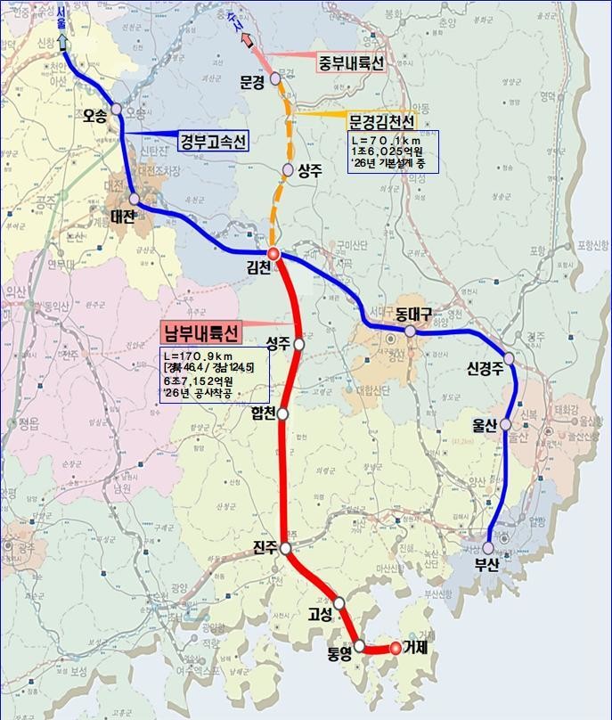 남부내륙철도는 경상북도 김천시 삼락동에서 경상남도 거제시 사등면까지 총 연장 약 174.6㎞를 연결하는 국가철도망으로, 시속 250㎞급 고속·준고속 철도로 건설된다. 주요 정차역은 김천, 성주, 합천, 진주, 고성, 거제 등이며, 총사업비 약 7조 974억 원이 투입된다. 2031년 개통 시 김천에서 거제까지의 이동시간은 기존 2시간 이상에서 약 1시간 내외로 대폭 단축될 전망이다.