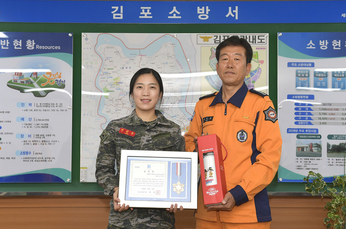 김포소방서는 18일 금요일, 민 대위의 선행에 대해 소방서장 표창장을 수여하였다.