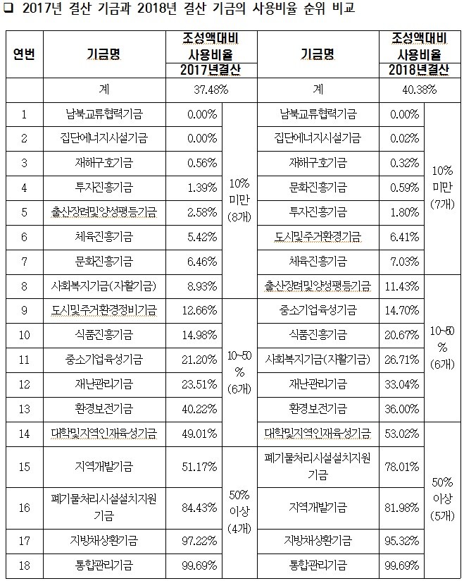 이 의원은 17년과 18년 결산 기준으로 기금의 사용비율을 분석하였다면서 총 기금 18개(통합관리기금 포함) 중에서 17년과 18년 각각 10%미만의 사용실적을 보인 기금은 남북교류협력기금을 비롯한 7~8개이고 10~50%미만 사용한 기금은 6개뿐이라며, 대부분의 기금은 활용도가 미진하고 대부분 기금액 늘리는데 급급하고 있다고 강하게 지적하였다.