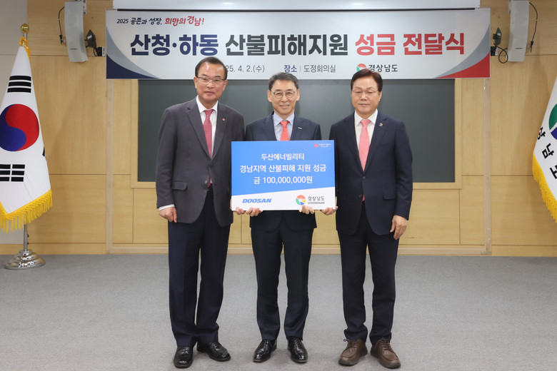 정연인 두산에너빌리티 대표이사 부회장과 최재호 창원상공회의소 회장은 2일 오후, 경남도청을 방문해 박완수 도지사에게 성금을 직접 전달했으며, 성금은 경남사회복지공동모금회와 대한적십자사 경남지사를 통해 산청.하동 지역 주민들의 생활 안정과 피해 복구 등을 위해 사용될 예정이다.
