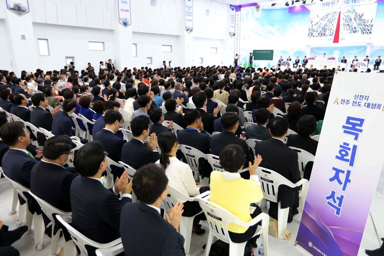 신천지예수교 증거장막성전(총회장 이만희·이하 신천지예수교회)은 13일 목회자 250여 명을 비롯 총 1만 6000여 명이 참석한 가운데 ‘신천지 전주 전도 대성회’를 개최했다. 대성회가 열린 신천지 전주교회 본관과 별관은 물론 실외주차장까지 참석자들로 가득 찼다. 그럼에도 현장 수용인원의 한계와 안전을 고려해 참석을 희망한 모든 이를 초청할 수 없었다.