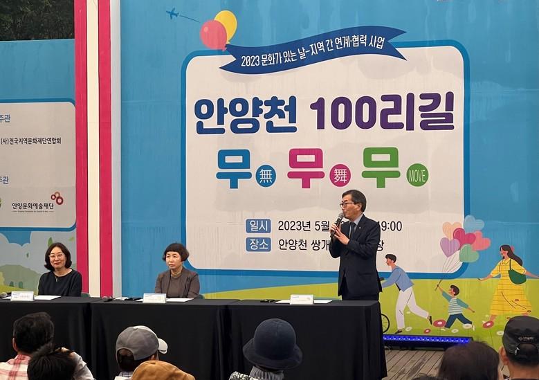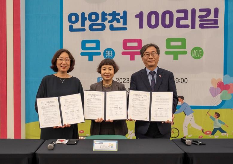 3개 문화기관 업무협약을 바탕으로 8월과 10월 다양한 문화행사 추진 [세계타임즈=안양시 이영진 기자] 안양문화예술재단(대표이사 박인옥)은 지난 30일 안양천 쌍개울 문화광장에서 광명문화재단(대표이사 이연선) 및 금천문화재단(대표이사 오진이)과 ‘안양천 100리길, 무무무(無舞Move)’ 추진을 위한 업무협약을 체결했다고 31일 밝혔다.