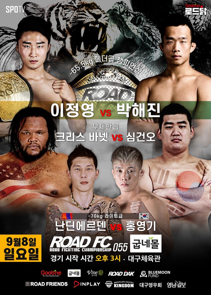 [세계타임즈 김인수기자] ROAD FC (로드FC)는 내달 8일 대구체육관에서 굽네몰 ROAD FC 055를 개최한다. 이날 메인 이벤트로 ‘페더급 챔피언’ 이정영과 ‘도전자’ 박해진이 출격, 페더급 타이틀전을 치른다.
