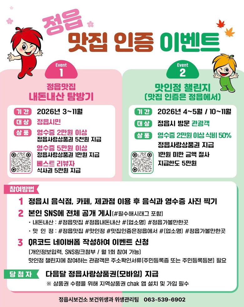 이벤트 신청은 결제 금액이 2만원 이상인 영수증에 한해 가능하다. 참여자에게는 영수증 금액에 따라 2만원 이상일 경우 5000원, 5만원 이상일 경우 1만원의 모바일 정읍사랑상품권이 지급된다. 상품권을 받기 위해서는 ‘지역상품권 Chak(착)’ 애플리케이션 설치·가입이 필수다. 또한 이벤트 기간 내 베스트 리뷰어로 선정된 참여자에게는 5만원 상당의 식사권이 추가로 제공될 예정이다.