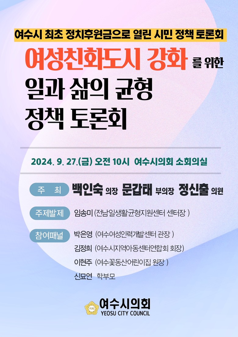 - 여성들이 가정과 직장에서 성공적으로 역할을 수행할 수 있는 정책을 발굴하고 관련 제도의 개선 방안을 모색하는 기회될 것 [여수시 세계타임즈=우덕현 기자] 여수시의회(의장 백인숙)는 오는 9월 27일 10시 의회 소회의실에서 ‘여성친화도시 강화를 위한 일과 삶의 균형 정책 토론회’를 개최한다고 밝혔다.
