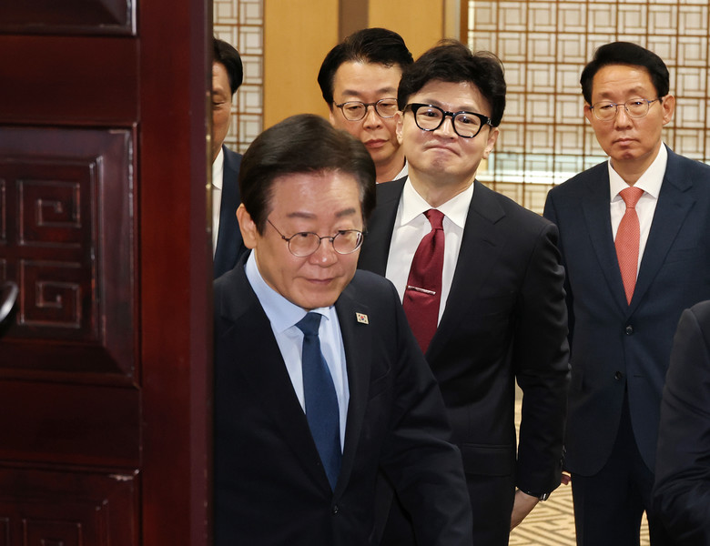 회담장 나서는 한동훈-이재명 대표