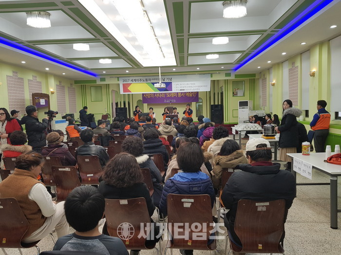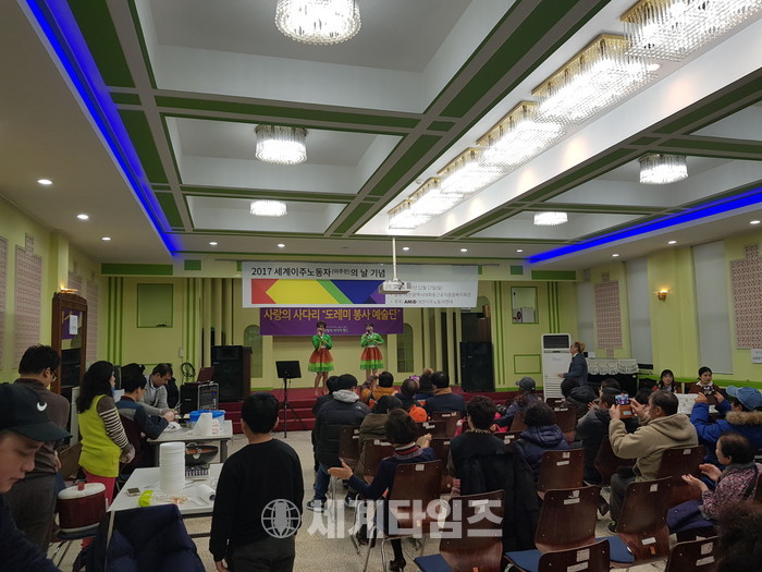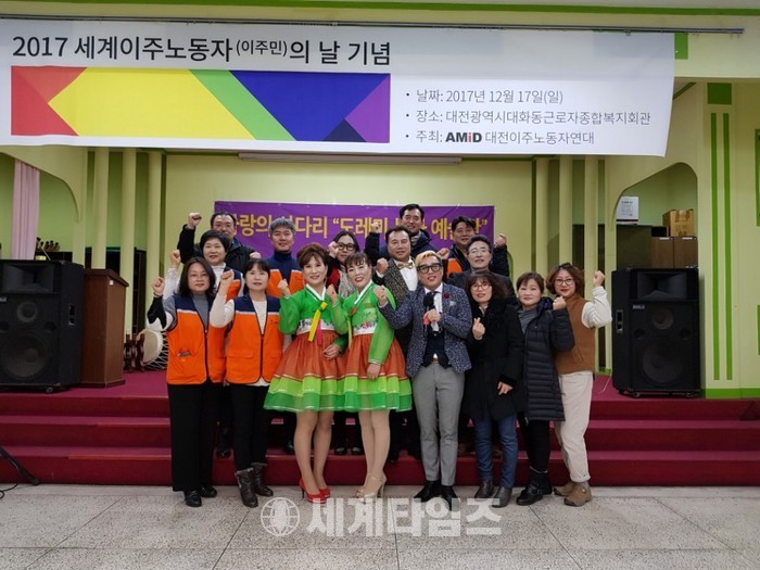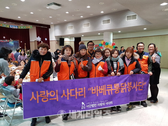[대전=세계타임즈 이장성 기자] 6천명의 회원들이 활동하고 있는 SNS 봉사단체인 사랑의 사다리 밴드(리더 이정제)는 17일 오전10시 대전시다문화가족지원센터에서 열린 러시아 다문화가족 크리스마스 행사와 오후 3시 대전시 근로자종합복지관에서 진행된 2017년 세계이주민의날 기념행사에서 바비큐통닭, 위문공연 봉사로 한국사회의 따뜻한 정을 전달하였다.