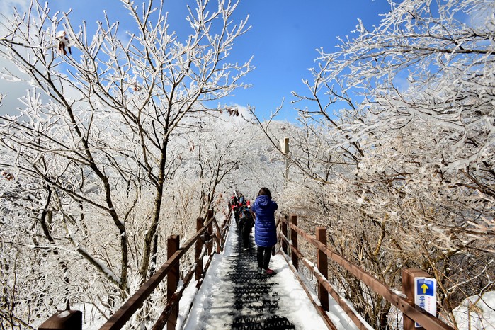 기후 온난화로 남부지방에선 거의 눈 소식이 없는 가운데 우수와 경칩이 10일, 밀양의 영남알프스에 하얀 눈이 쌓여 관광객들의 발길이 끊이질 않았다.