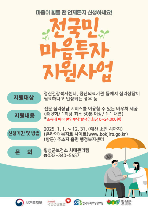‘전국민 마음투자 지원사업’은 우울·불안 등 정서적 어려움을 겪는 주민들에게 전문 심리상담 서비스를 제공하며 120일간 총 8회 서비스 이용이 가능하다. 단, 대상자의 소득수준에 따라 본인부담금(0~30%)이 발생할 수 있다.