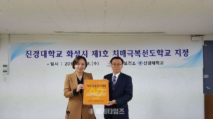 [화성시=세계타임즈 이영진 기자] 신경대학교(총장직무대행 이서진)와 화성시 보건소(보건소장 김장수)는 2017년 10월 18일 신경대학교 세미나실에서 양 기관의 협력사항과 지역의 치매노일들을 위한 체계적이고, 다양한 지원 및 활동 프로그램을 구축하기 위한 간담회를 가진 후, ‘화성시 제1호 치매극복선도대학’이라는 의미 있는 현판식을 거행했다.