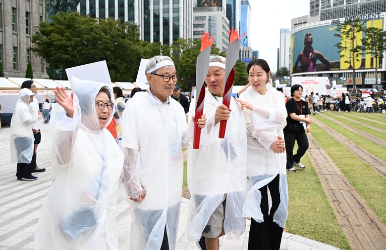 먼저 치매 당사자와 가족이 직접 참여한 성화 봉송 릴레이가 진행됐다. 13개 팀(치매 대상자·가족 38명)이 희망의 불꽃을 이어받으며 걷는 모습은 어려움을 함께 극복하겠다는 강한 의지를 보여주면서 현장을 찾은 시민들에게 깊은 울림을 전했다.