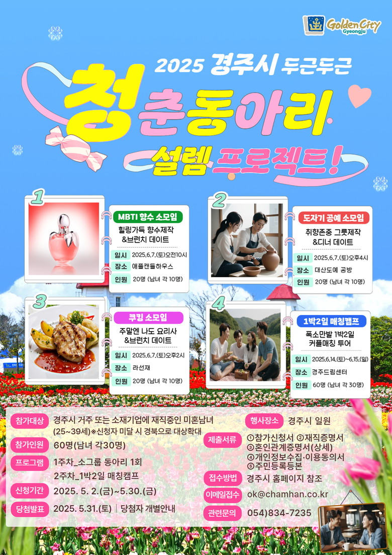 주낙영 경주시장은 “이번 프로젝트가 청년들이 부담 없이 소통하며 소중한 인연을 만들어가는 계기가 되길 바란다”며 “앞으로도 결혼 친화적 환경 조성과 지역 정착을 유도할 수 있는 다양한 프로그램을 지속 추진하겠다”고 말했다.