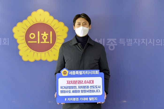 [세종=세계타임즈 이채봉 기자] 세종특별자치시의회 이태환 의장은 21일 ‘지방분권 2.0’ 시대의 개막을 응원하기 위한 ‘자치분권 기대해’ 챌린지에 동참했다.