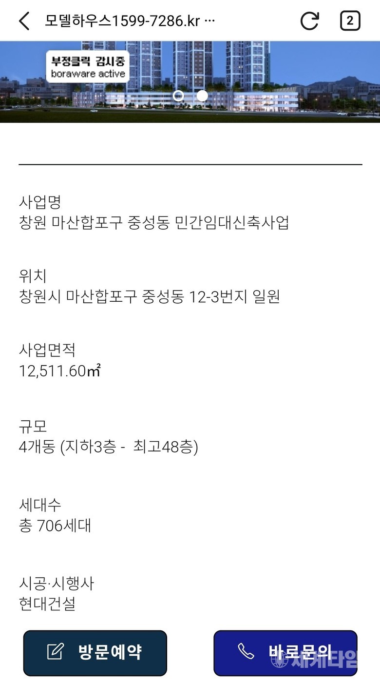 [세계타임즈 = 이판석 기자] 창원시가 최근 홍보관이나 인터넷 등으로 홍보되는 '민간임대주택 분양'에 대하여 시민들에게 조합원(투자자 등) 가입에 유의해야 한다고 주의를 당부한 가운데, 최근 창원시 마산합포구 중성동 일대에 최고층 49층(예정)인 마산의 랜드마크로 자리매김할 중성동 하이엔드시티 민간임대아파트 분양사업이 지역 주민들에게 아무런 설명없이 지난 11일 개관하고 본격적 운영하는 가운데 일부 분양 사이트에는 시공과 시행에 현대건설로 표기되어 있었다.