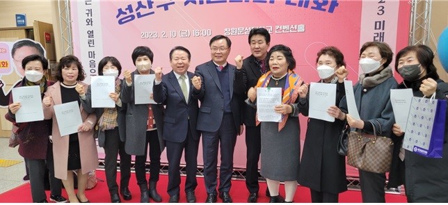 | ▲ 10일 창원 문성대에서 열린 ‘2023 창원특례시 시민과의 대화’ 행사에 참석한 홍남표 창원시장과 이재두 경남도의원, 창원 성산구 지역 주민 대표 등이 가음정공원에 파크골프장 설치를 요청하는 서명서 전달식 후 함께 기념촬영을 하고 있다./이재두 의원 제공/ |