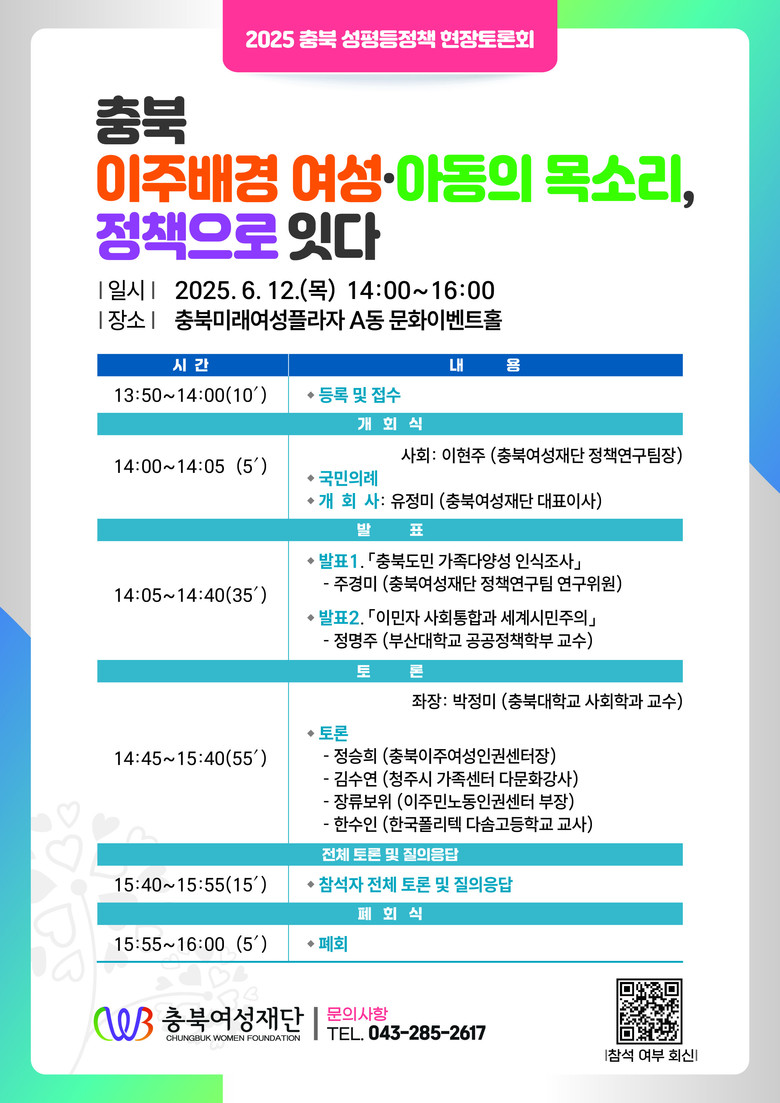 이번 토론회는 이주배경 여성과 아동이 직면한 현실을 지역사회와 공유하고, 충북도민의 가족 다양성에 대한 인식 확산 및 향후 정책과제 발굴을 목적으로 한다.