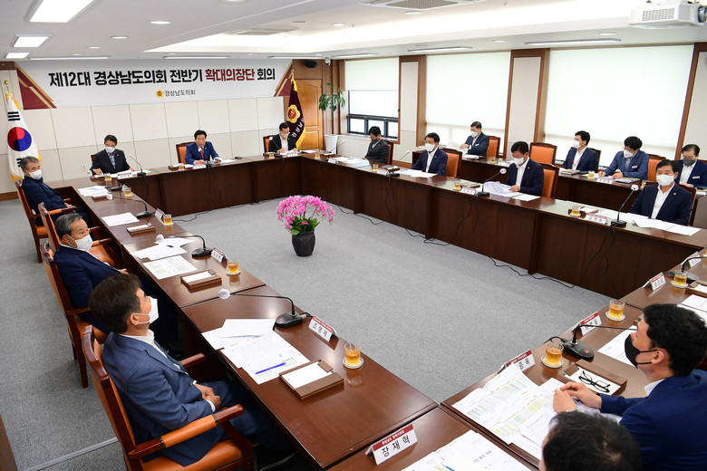 [세계타임즈=경남 최성룡 기자] 제12대 경상남도의회 전반기 확대의장단(의장 김진부)은 14일 오후 1시 첫 회의를 열어 경남도의 하반기 조직개편안과 제2회 추경예산안, 도 교육청의 교육비특별회계 제1회 추경예산안에 대해 사전보고를 받고 현안을 점검했다.