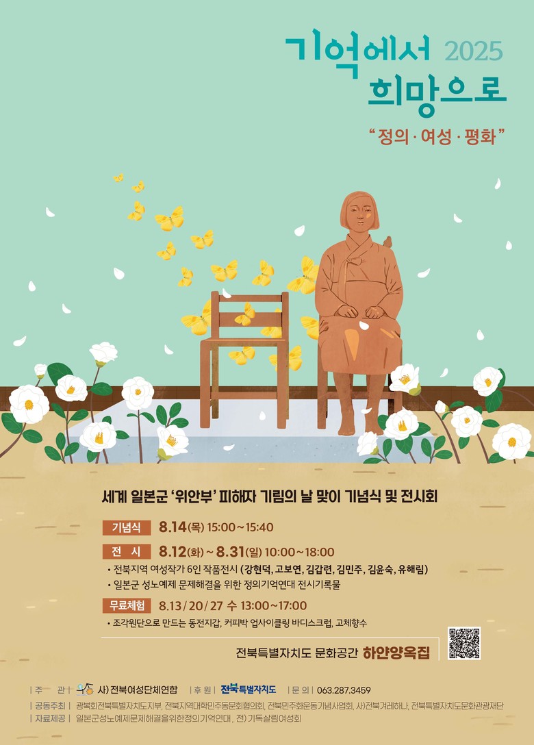 이번 추모행사는 (사)전북여성단체연합(공동대표 박영숙·송경숙) 주관으로 8월 12일 시작해 오는 31일까지 이어진다. ‘정의·여성·평화’를 주제로 한 전북지역 여성작가 6인의 회화, 사진, 조형물, 영상 작품과 일본군 성노예제 문제 해결을 위한 정의기억연대 기록물이 전시되며, 전북지역 일본군 ‘위안부’ 생존자들의 증언 영상도 상영된다.