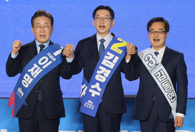 더불어민주당 대선 경선 후보들이 19일 오후 충북 청주체육관에서 열린 '제21대 대통령선거 후보자 선출을 위한 충청권 합동연설회'에 참석해 있다. 왼쪽부터 이재명, 김경수, 김동연 후보. 2025.4.19