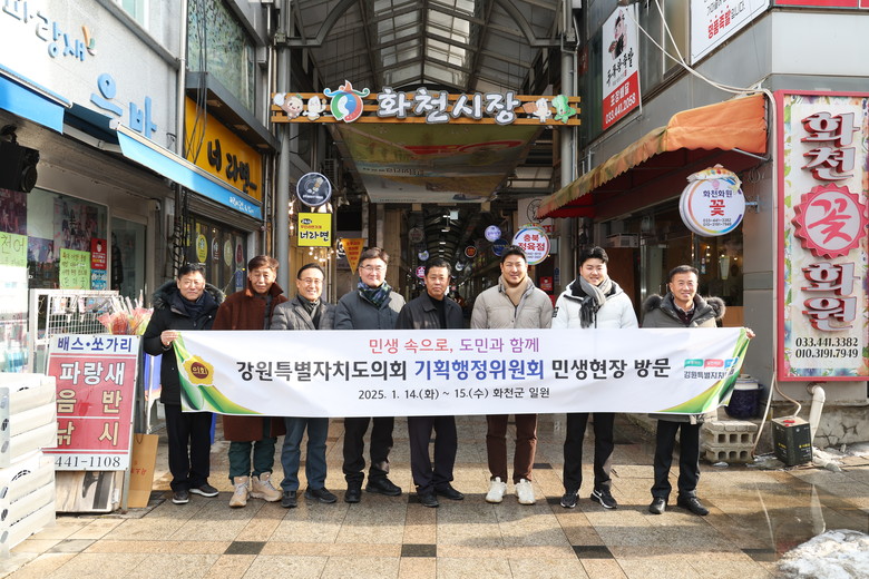 [강원도 세계타임즈=김민석 기자] 강원특별자치도의회 기획행정위원회(위원장 문관현)는 1월 14일(화) ~ 15일(수)까지 2일간 접경지역에 위치한 화천전통시장과 화천커뮤니티센터를 방문하여 지역경제 상황에 대한 점검과 함께 돌봄서비스 운영실태를 점검하였다.