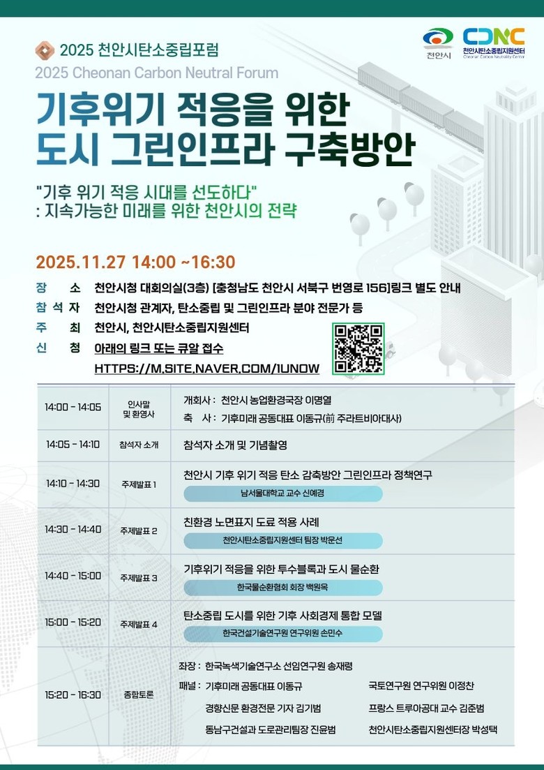 포럼에서는 기후변화 대응정책의 실천력 확보를 위한 ‘기후위기 적응을 위한 도시 그린인프라 구축방안’을 주제로 ‘천안시 기후위기 적응 탄소감축방안 그린인프라 정책’ 기조강연과 도시 기후위기 적응을 위한 물순환 정책, 친환경 노면표지 도료 적용사례 등이 제시됐다.