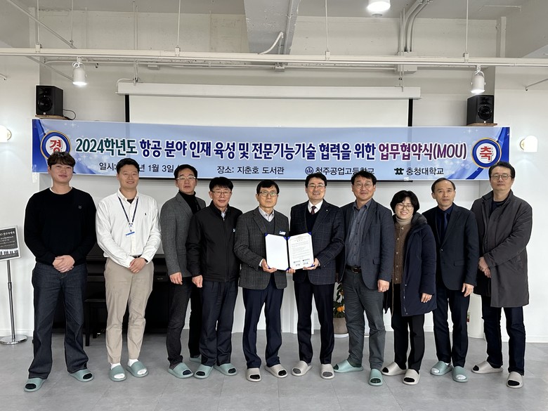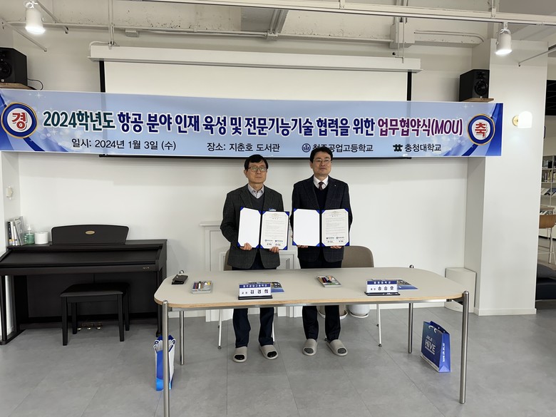 [충북 세계타임즈=이현진 기자] 청주공업고등학교(교장 김경희)와 충청대학교(총장 송승호)는 3일(수), 지춘호도서관에서 항공모빌리티 분야 교육 협력을 위한 업무 협약을 체결하였다.