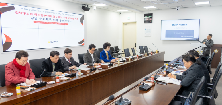 [강남구 세계타임즈=심하린 기자] 서울특별시 강남구의회 의원연구단체인 ‘강남 문화체육 미래비전 포럼’(대표 윤석민 의원)이 강남구의 문화·체육 인프라 확충과 정책 대안 마련을 위한 본격적인 연구 활동에 돌입했다.