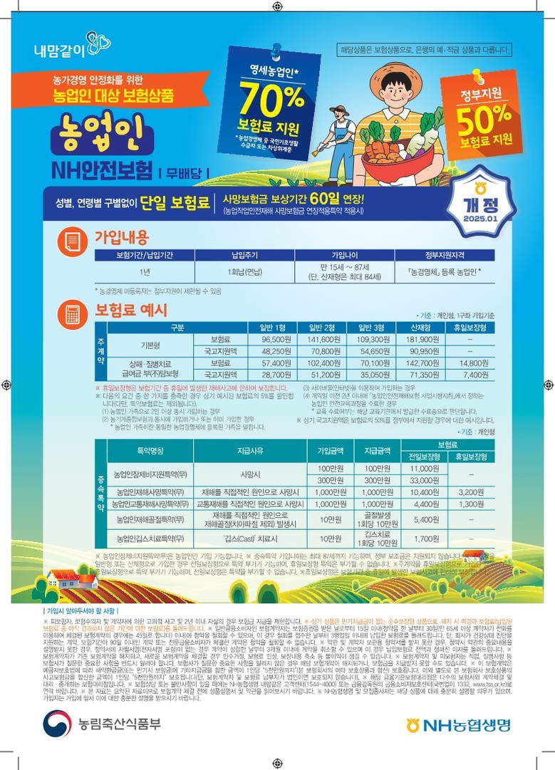 특히 농업경영체에 등록된 가족과 동시 가입하거나, 농작업 재해예방 교육 등을 수료하면 주계약 보험료의 5%를 추가로 할인받을 수 있다.
