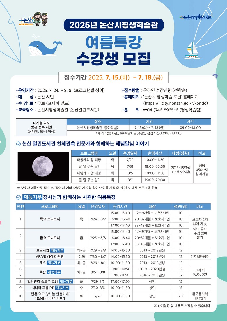 수강신청은 논산시에 주소를 둔 시민이라면 논산시 평생학습포털 홈페이지를 통해 누구나 신청할 수 있으며, 온라인 접수가 어려운 디지털 약자를 위해 방문 접수도 함께 진행한다.
