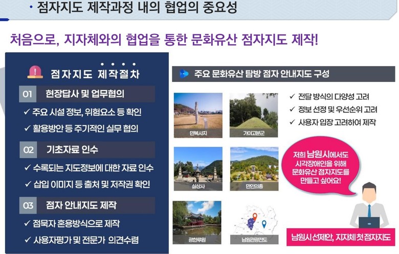 국토지리정보원과 남원시는 이번 남원 문화유적 점자 안내지도에서 시각장애인들이 남원의 대표 문화유산인 광한루원, 실상사, 만인의총, 가야고분군, 만복사지 5개소 문화‧유적지에 대한 구조와 특징을 직접 느껴며, 그 문화‧역사적 가치를 보다 깊게 이해하고 스스로 탐방할 수 있도록 점자와 돌출 형태의 촉각적 형태로 제작할 예정이다.