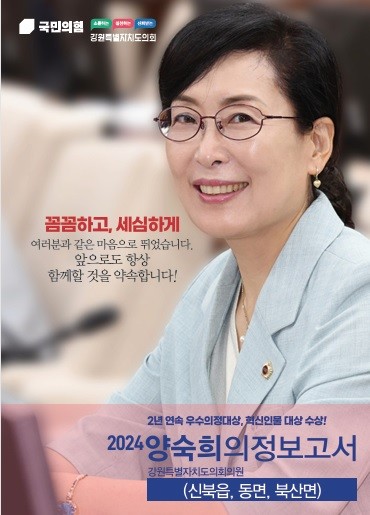 [강원도 세계타임즈=김민석 기자] 양숙희 강원특별자치도의원(안전건설위, 춘천6)은 10월 10일(목) 강원특별자치도의원 중 최초로 의정보고서를 제작 완료하고 조만간 지역주민들에게 배포할 계획”이라고 밝혔다.