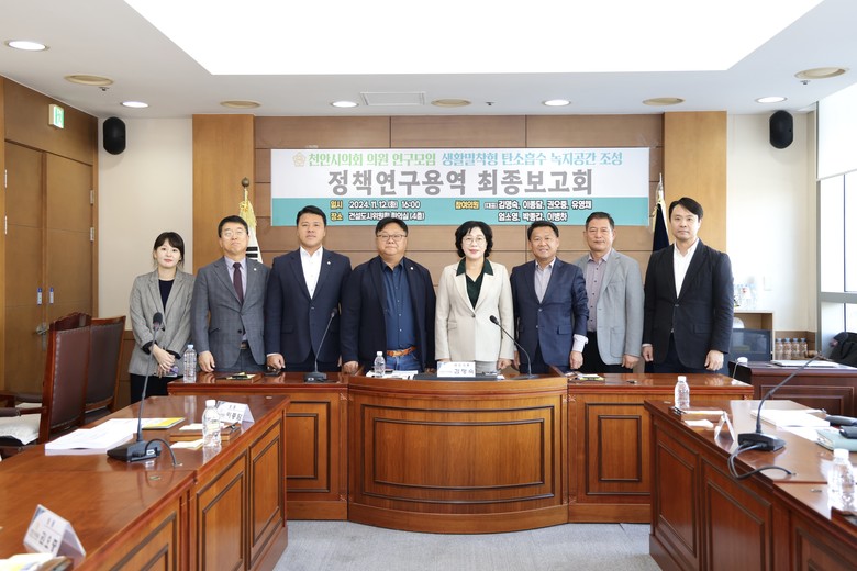 [천안시 세계타임즈=백택기 기자] 천안시의회(의장 김행금)는 지난 12일 ‘생활밀착형 탄소흡수 녹지공간 조성을 위한 연구모임’(김명숙 대표의원, 이종담, 권오중, 유영채, 엄소영, 박종갑, 이병하 의원)의 최종보고 간담회를 성황리에 개최했다고 13일 밝혔다. 이번 간담회는 김명숙 대표의원과 연구모임 의원들, 관계 공무원이 참석한 가운데 건설도시위원회 회의실에서 진행되었다.