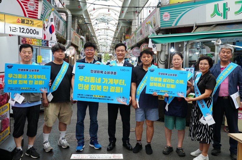 | ▲ 서울 성북구가 민생회복 소비쿠폰 2차 지급을 위한 체계적인 준비를 마치고, 오는 9월 22일부터 지급을 시작한다. 이승로 성북구청장(왼쪽에서 네번째)이 전통시장을 찾아 상인들과 함께 민생회복 소비쿠폰 지역 내 신속 사용을 권장하는 캠페인을 펼치고 있다. |