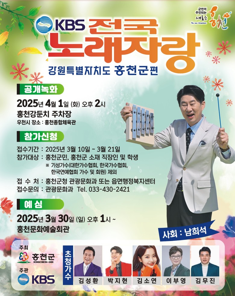 이번 전국노래자랑 홍천군 편은 오는 5월 이후 KBS1 채널을 통해 전국 방영될 예정이다. 특히 김성환, 박지현, 김소연, 이부영, 김무진 등 국내 정상급 트로트 가수 5명이 특별 출연한다.