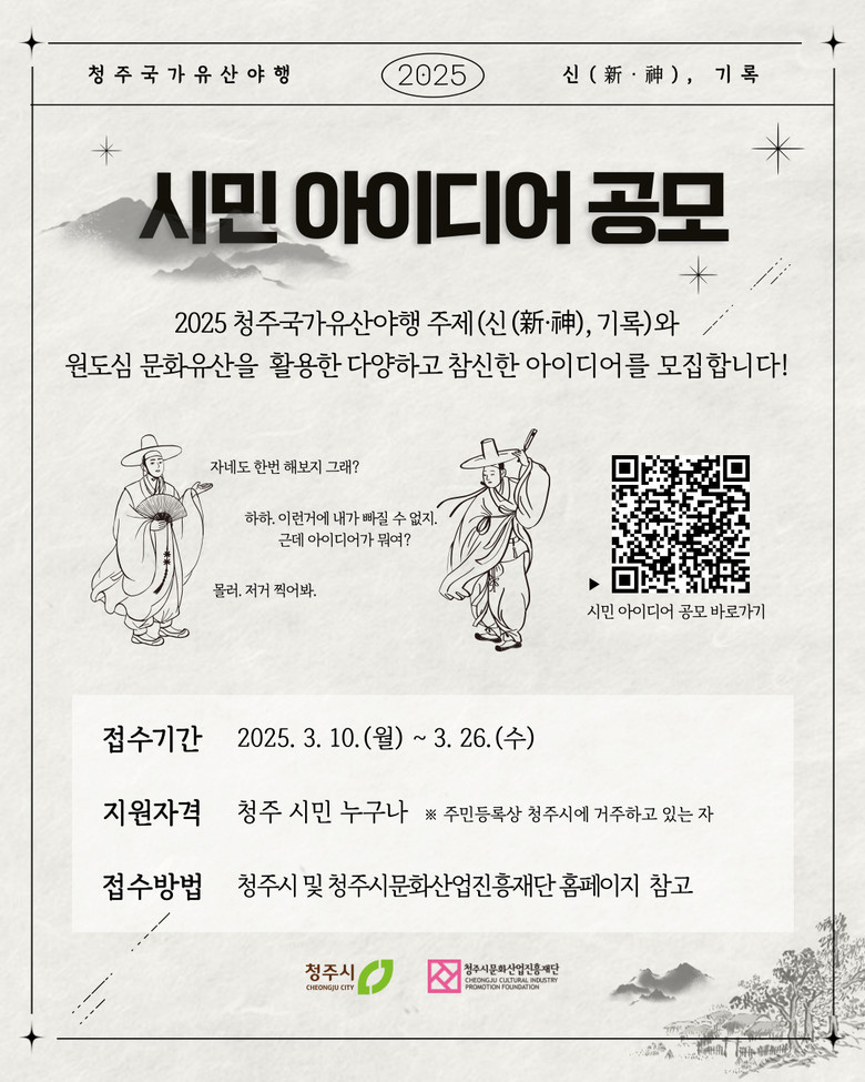 - 올해의 주제 ‘신(新·神), 기록’구현할 아이디어 대환영 [세계타임즈=청주시 이현진 기자] 청주시와 청주시문화산업진흥재단(대표이사 변광섭, 이하 청주문화재단)이 오는 26일(수)까지, ‘신(新·神), 기록’을 주제로 펼쳐질 ‘2025 청주 국가유산 야행 시민 아이디어 공모’를 진행한다.