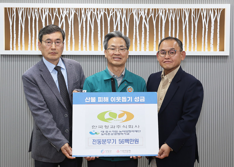 [영양군 세계타임즈=한윤석 기자] 한국청과(주)는 최근 영양군 산불 피해를 입은 지역 주민들을 돕기 위해, 5월 1일 영양군청을 방문해 전동분무기 200대(5,600만원 상당)를 전달하며 따뜻한 마음을 전했다.