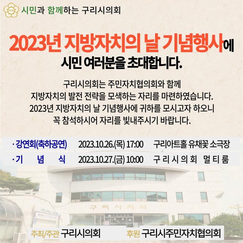 [구리시 세계타임즈=송민수 기자] 구리시의회(의장 권봉수)는 10월 26일(목)~27일(금), 양일간 「2023년 지방자치의 날 기념행사」를 개최한다. 지방자치에 대한 시민들의 관심을 높이고 지방자치 발전 방향을 모색하고자 10월 26일(목) 17시, 구리아트홀 유채꽃 소극장에서 “주민에서 주인으로!”라는 주제로 강연회(축하공연)를 열고, 10월 27일(금) 10시, 구리시의회 멀티룸에서 지방자치 발전 유공자 표창 등 「지방자치의 날 기념식」 행사를 갖는다.