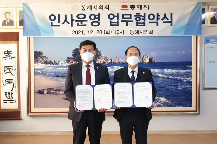 [동해시=세계타임즈 김민석 기자] 동해시의회(의장 김기하)는 28일 오전 10시 동해시의회 의장실에서 내년 지방의회 인사권 독립에 따른 원만한 인사 운영을 위해 동해시(시장 심규언)와 업무협약식을 가졌다.