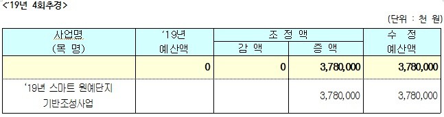 한편, 농정국 소관 2019년도 제4회 강원도 추가경정예산안은 예산편성 후 공모사업 확정된 ‘19년 스마트 원예단지 기반조성사업 국비 37억 8,000만원을 추가로 반영하여 수정 가결하였다.
