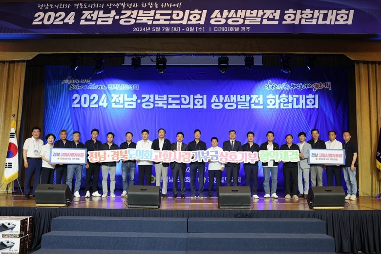 [전남 세계타임즈=우덕현 기자] 전라남도의회(의장 서동욱)는 경상북도의회와의 상생 10년차를 맞아, 7일 경주 더케이호텔에서 「전남‧경북도의회 2024년 상생발전 화합대회」를 공동 개최하여 지속적인 협력과 상생을 다짐했다.