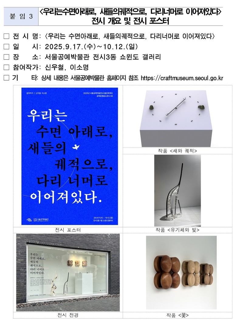 한편, 9월 17일(수)부터 10월 12일(일)까지는 전시3동 1층 쇼윈도 갤러리에서 신우철·이소명의 공동기획전시 <우리는 수면 아래로, 새들의 궤적으로, 다리 너머로 이어져있다>가 열린다. 두 작가는 서울문화재단 신당창작아케이드 입주작가로 활동중이다. 나무와 3d 프린팅을 활용한 가구 및 설치작업을 통해 자연과 인위의 연결을 드러내며, 도시 속 사유의 순간을 표현한다.