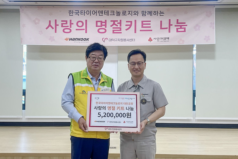 이번 나눔은 한국타이어앤테크놀로지가 대덕구자원봉사센터에 지정 기탁한 성금으로 마련됐으며, 송편과 사과·배, 약과, 식혜 등으로 구성된 키트 50세트를 지역 취약계층 가정에 전달했다.