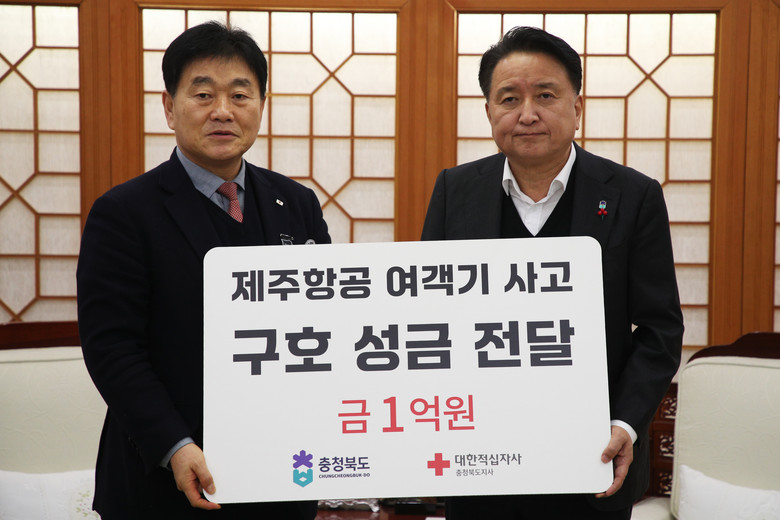 충청북도 사회복지기금(재해구호기금)으로 마련된 성금은 대한적십자사에 지정 기탁돼 제주항공 여객기 사고 희생자 유가족의 심리 회복 및 생활 안정 지원 등에 사용된다.