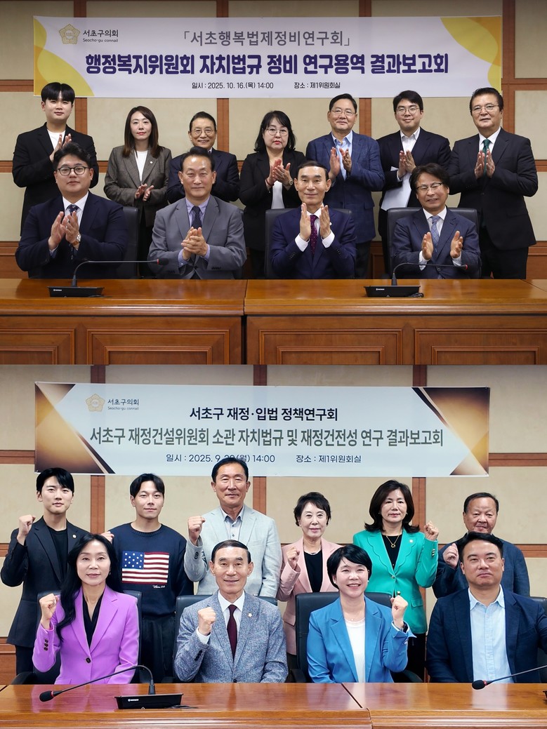 [서초구 세계타임즈=이장성 기자] 서초구의회(의장 고선재) 의원연구단체인 ‘서초구 재정·입법 정책 연구회’와 ‘서초행복법제정비연구회’가 잇달아 연구용역 결과보고회를 개최하며 자치입법 품질 개선을 목표로 연구를 활발히 이어가고 있다.