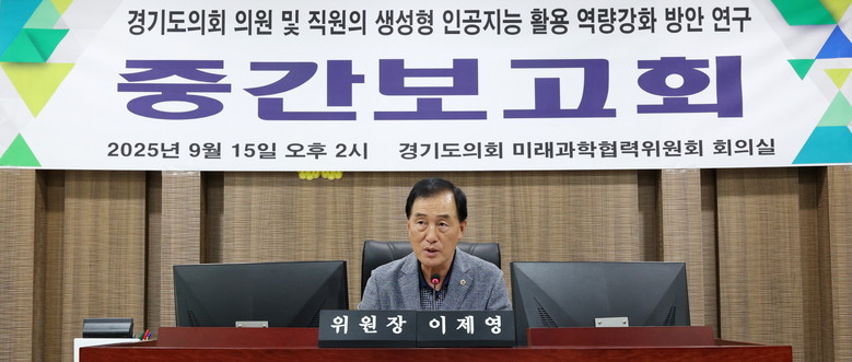 [경기도 세계타임즈=송민수 기자] 경기도의회 미래과학협력위원회(위원장 이제영, 국민의힘, 성남8)는 9월 15일, 경기도의회 위원회 회의실에서 『경기도의회 의원 및 직원의 생성형 인공지능 활용 역량강화 방안 연구』에 대한 중간보고회를 개최했다.