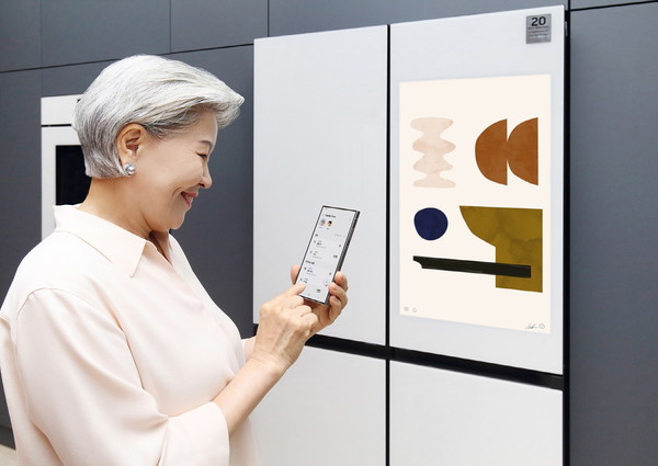 | ▲삼성전자 모델이 부모님을 위한 AI 라이프 솔루션, 스마트싱스 '패밀리 케어' 서비스의 복약시간 알림 등 '일정 관리' 기능을 체험하고 있다. (사진=삼성전자 제공) |