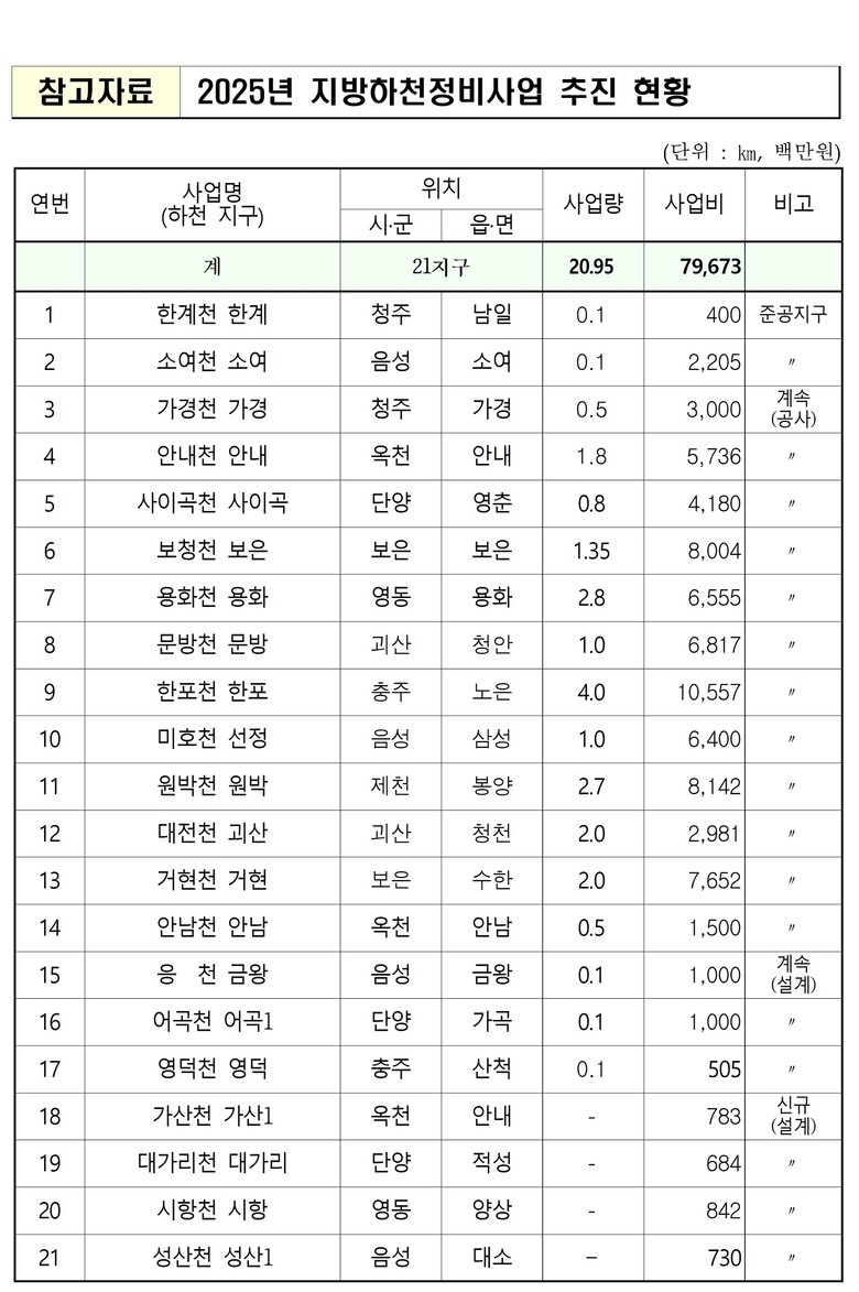주요 사업으로는 충주시 한포천 한포지구 지방하천정비사업 등 21지구에 796억원을 투입할 예정으로, 2월 착공을 위하여 사전 준비에 매진하고 있다.