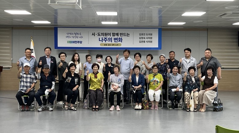 이날 간담회는 나주시의회 김정숙.김관용.김해원 의원 등 시.도의원이 함께 마련한 뜻깊은 자리로 관계자를 비롯해 지역민 40여 명이 참석한 가운데 지역의 민원을 청취하고 현장을 직접 찾아가는 의정활동을 펼쳤다.