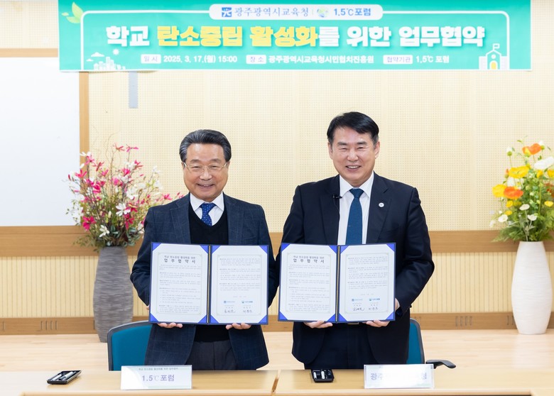 | ▲ 광주시교육청과 1.5℃포럼이 '학교 탄소중립 활성화를 위한 업무협약'을 체결했다(좌측 1.5℃포럼 최용국 회장과 우측 이정선 교육감) |